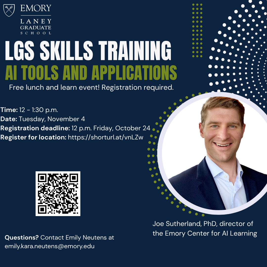 Join us for our next LGS Skills Training session on the practical use of AI tools and applications with Joe Sutherland, PhD, director of the Emory Center for AI Learning.