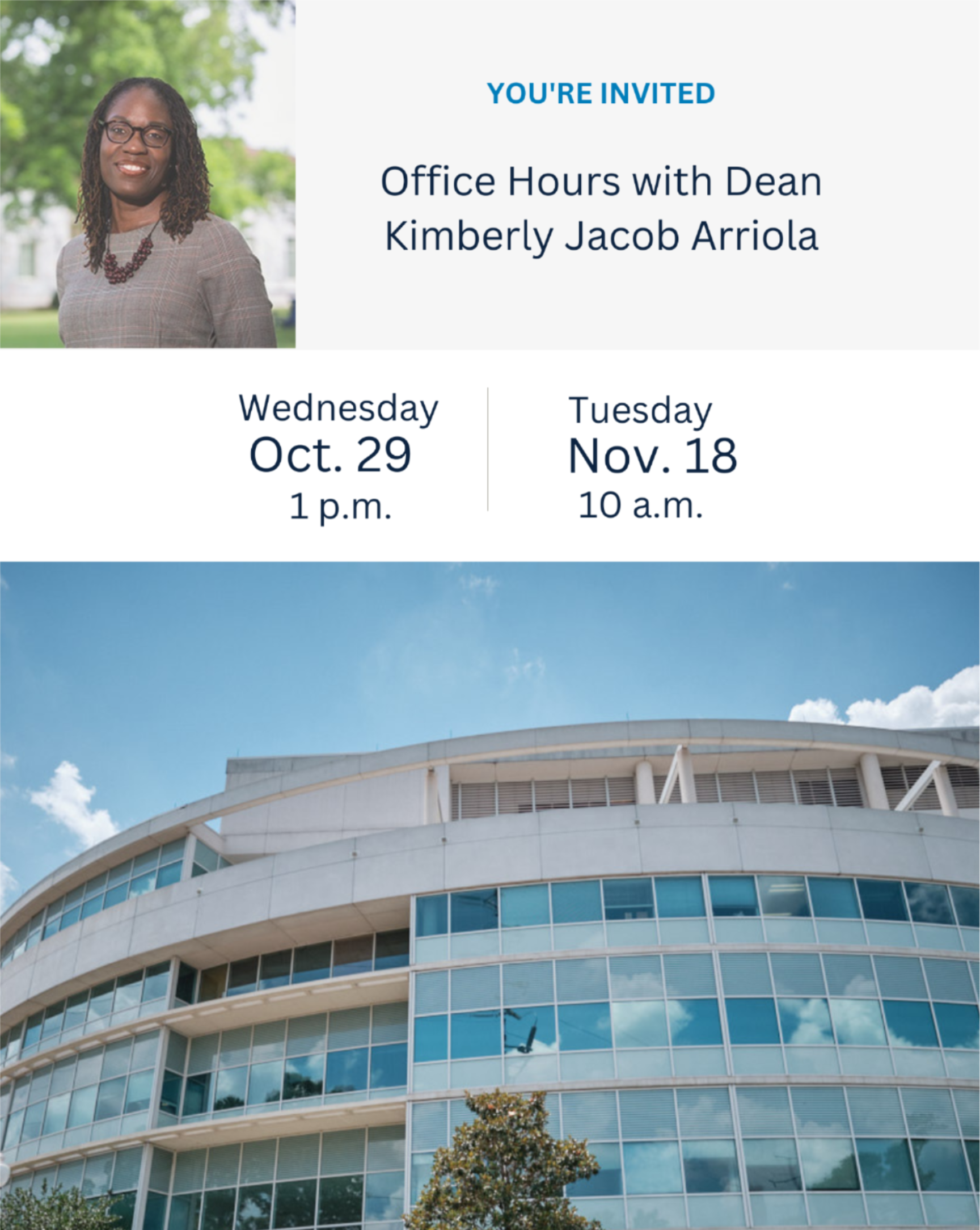 Dean Kimberly Jacob Arriola invites graduate students to join her for an informal conversation during Office Hours with the Dean. This is a chance to share your experiences, ask questions, and connect directly with Dean Arriola in a welcoming and open setting. No appointment needed—just stop by the LGS office located in Suite 200 of the North Decatur Building, sign in when you arrive and enjoy light refreshments while you wait. Hours are first come, first serve, so mark your calendars!