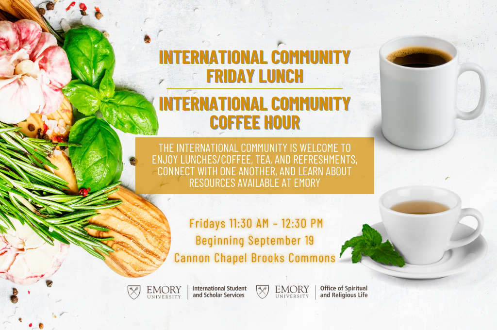 International Community Friday Lunch and Coffee Hour International Community Friday Lunch (ICFL) is back! This long-standing collaboration between the Office of Spiritual and Religious Life (OSRL) and International Student and Scholar Services (ISSS) features a new format that blends ICFL with a new program called International Community Coffee Hour (ICCH). These events will share helpful resources from sponsors and create a space for the international community to gather over free lunches or coffee, tea, and refreshments.
