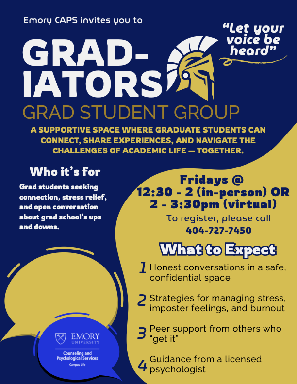 Looking for a supportive space to connect with other graduate students? CAPS offers a grad student support group, along with other group counseling opportunities.