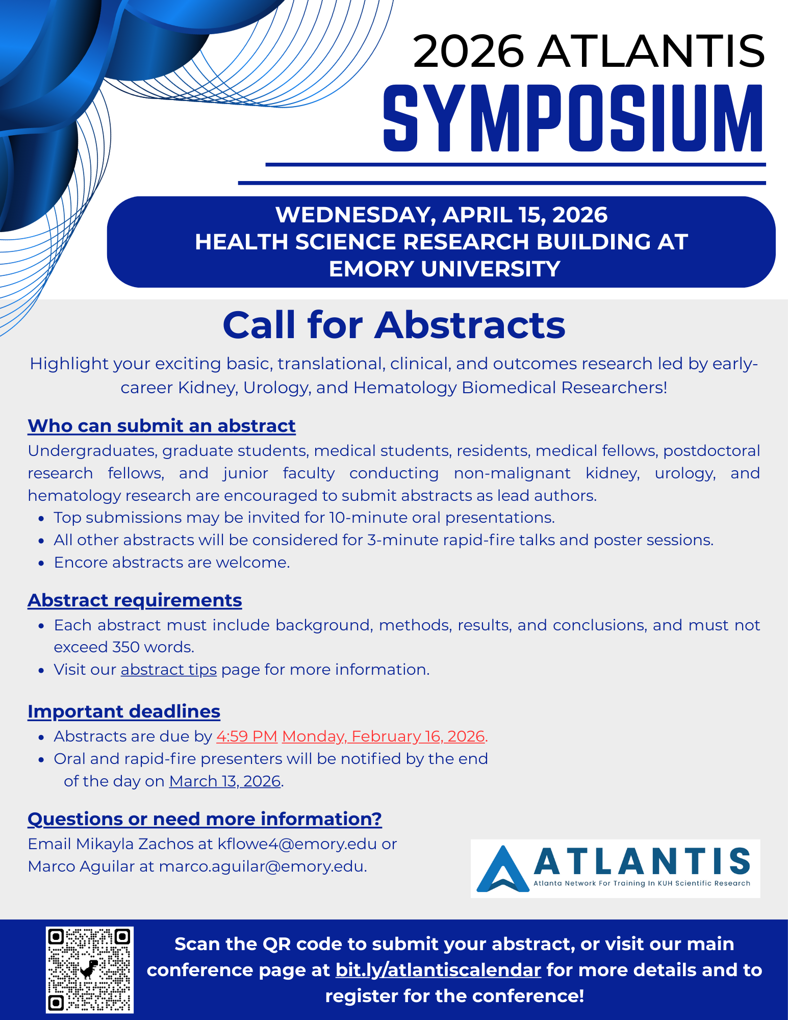Submit your abstract today! Undergraduates, graduate students, medical students, residents, medical fellows, postdoctoral research fellows, and junior faculty (assistant professor or below) conducting non-malignant kidney, urology, and hematology research are all invited to submit abstracts to the 2026 ATLANTIS Symposium.