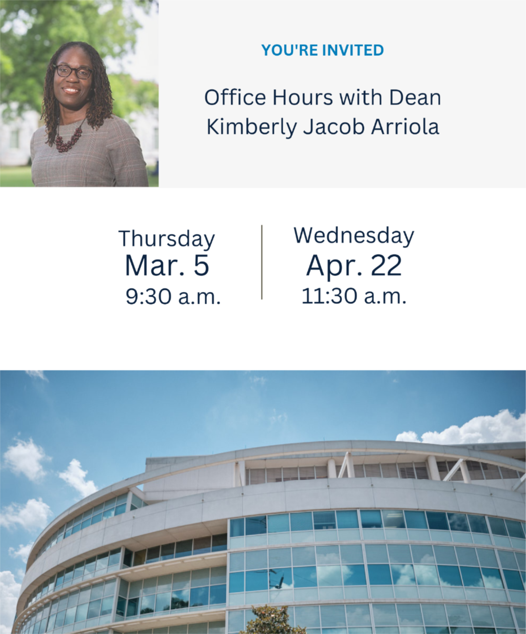 Save the Date: Spring Office Hours with Dean Kimberly Jacob Arriola LGS Dean Kimberly Jacob Arriola is offering an opportunity for all LGS students to connect directly one-on-one during her office hours. Upcoming Office Hours